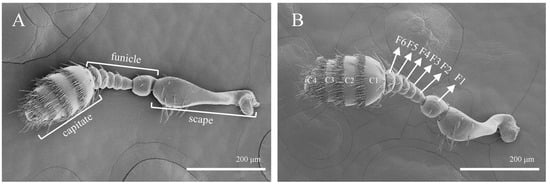 Morphology of T. pilifer antennae. (A) Male; (B) female; F1–F6: the 1st to 6th subsections of the funicle; C1–C4: the 1st to 4th subsections of the capitate.