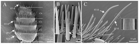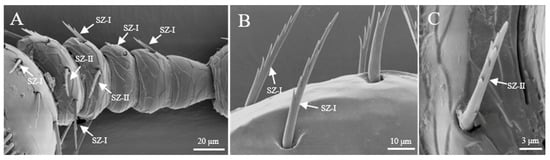 Research on the morphology and structure of insect sensilla is fundamental to understanding their olfactory recognition mechanisms and behavior [5,6,7]. Insects use highly specialized sensilla to detect physical and chemical stimuli from the external environment [8,9], enabling them to identify hosts. These sensilla are distributed across the insect’s body, primarily concentrated on the antennae, mouthparts, and legs, acting as the “windows” through which insects interact with their surroundings [5,10,11]. The antennae serve as the main sensory organs in insects, with various types of sensilla present on their surface [12,13,14,15]. Based on their physiological functions, sensilla can be classified into mechanoreceptors, chemoreceptors, and thermohygroreceptors [16,17,18]. Some sensilla have micropores on their surface, particularly chemoreceptors [19,20,21], through which odor molecules pass into the sensillar lymph and are transported by odorant-binding proteins (OBPs) to the vicinity of the odor receptors on the dendritic membranes of sensory neurons. After a series of reactions, chemical signals are converted into electrophysiological signals and transmitted to the central nervous system [22,23,24], thus regulating behaviors such as feeding, host location, oviposition, predator avoidance, and mate seeking [25,26,27,28]. The mouthparts are the feeding organs of insects and also contain various sensillar structures, with sensilla on the maxillary palps and labial palps playing a crucial role in host and food source recognition [29,30,31]. Compared to the antennae and mouthparts, research on the sensilla on the legs of insects is relatively limited. However, some studies suggest that various sensilla on the legs contribute to taste, olfaction, and thermohygroreception [31,32].