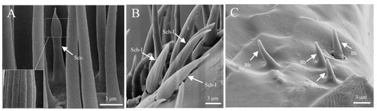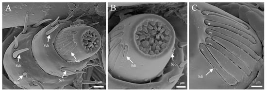 Sensilla chaetica are rigid and spine-like in appearance, with a smooth surface. They are located in a relatively wide, circular groove, measuring approximately 14.2 ± 2.7 μm in length and 1.7 ± 0.4 μm in basal width. These sensilla are distributed on the lateral sides of the maxilla, outer maxillary lobes, and labrum (Figure 6C,F and Figure 9).