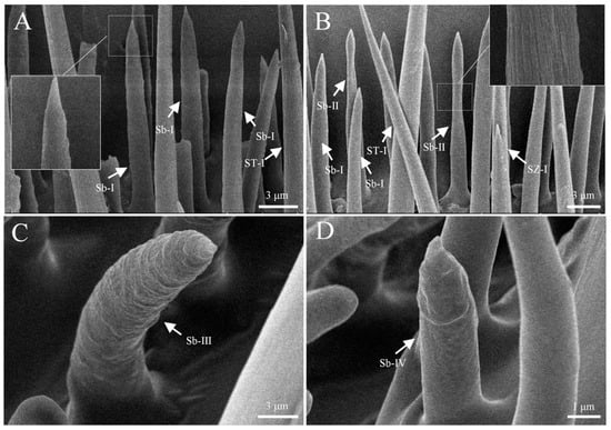 A total of six types of sensilla, including eleven subtypes, were identified on the antennae of Tomicus pilifer. These included sensilla trichoidea I and II (ST I and II), sensilla zigzag I and II (SZ I and II), sensilla coeloconica (Sco), sensilla chaetica (Sch), Böhm bristles (Bb), and sensilla basiconica I, II, III, and IV (Sb I, II, III, and IV). Notably, sensilla basiconica III were found exclusively on male antennae. Additionally, on segment F2 of the funicle, the male antennae were observed to be smooth, with no sensilla present; in contrast, sensilla chaetica were observed at the corresponding location on the female antennae (Table 1).