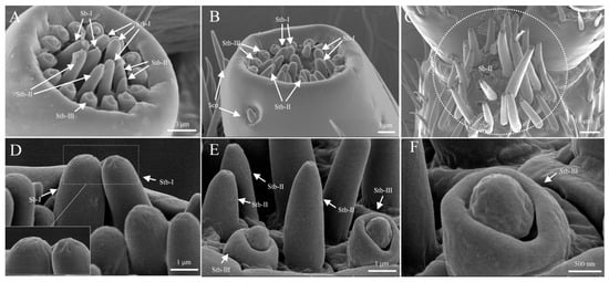 Sensilla twig basiconica are the second-largest sensilla in the distal sensillar field, densely distributed at the tips of the mandibular and labial palps. These sensilla are cone-shaped, with considerable variation in the shape of the conical tip, and can be divided into three subtypes: s. twig basiconica I, s. twig basiconica II, and s. twig basiconica III (Figure 7A,B). The apex of s. twig basiconica I features orderly arranged digitiform projections in the cuticular layer, which converge towards the center. The length of s. twig basiconica I is approximately 2.4 ± 0.2 μm, with a basal width of about 1.2 ± 0.1 μm (Figure 7D). S. twig basiconica II is similar in appearance to s. twig basiconica I, but the distal end has a concave pore resembling a volcanic crater. The length of s. twig basiconica II is approximately 3.1 ± 0.2 μm, with a basal width of about 0.9 ± 0.1 μm (Figure 7E). S. twig basiconica III is the smallest sensillum in the distal sensillar field, featuring a double-layered structure with an outer ring-like arrangement. S. twig basiconica III is located at the edge of the apical tip of the palp and arranged in a ring. The length of s. twig basiconica III is approximately 1.4 ± 0.2 μm, with a basal width of about 1.2 ± 0.1 μm (Figure 7F).