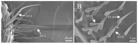 Morphology of sensilla trichoidea on mouthparts. (A) S. trichoidea I on mouthparts; (B) s. trichoidea II on mouthparts.