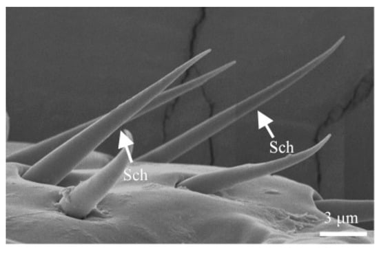 - Zacharuk, R.Y.; Shields, V.D. Sensilla of Immature Insects. Annu. Rev. Entomol. 1991, 36, 331–354. [Google Scholar] [CrossRef]