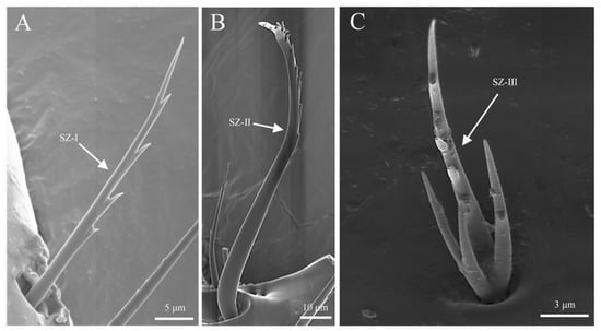 Morphology of sensilla zigzag on mouthparts. (A) S. zigzag I on mouthparts; (B) s. zigzag II on mouthparts; (C) s. zigzag III on mouthparts.