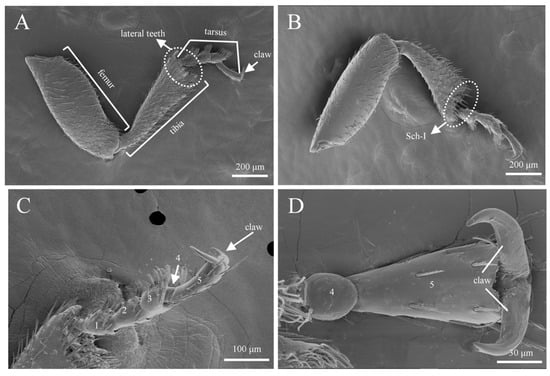 Each leg of T. pilifer is composed of three segments: the femur, tibia, and tarsus (Figure 12A). The distribution of sensilla on the inner and outer surfaces of the femur shows marked differences, with the outer surface densely covered with sensilla (Figure 12A,B). Additionally, at the junction between the tibia and tarsus, the outer surface exhibits lateral teeth, while the inner surface contains sensilla chaetica (Figure 12B). The tarsus consists of five segments, with segments 1–3 densely populated with sensilla. The fourth segment is small, embedded within the third segment, and lacks any sensilla. The fifth segment is longer, gradually widening from the base to the tip, with a few sensilla present, and ends in a large claw (Figure 12C,D).