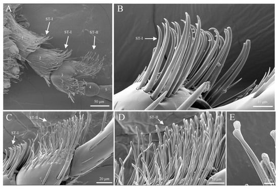 Compared to the antennae and mouthparts of beetles, studies on the ultrastructure of sensilla on the legs are scarce. In Tomicus pilifer, we identified three types of sensilla with five subtypes on the legs, including sensilla zigzag I and II, sensilla trichoidea I and II, and sensilla chaetica. Among these, sensilla zigzag and sensilla chaetica are almost entirely distributed on the femur and tibia. These types of sensilla are also common on the antennae and mouthparts and are often considered to primarily function as mechanoreceptors [32,63]. Sensilla trichoidea (ST) are densely distributed on one side of the tarsus, the side that is in direct contact with the ground when the beetle is crawling. As they come into direct contact with surfaces, sensilla located on the tarsus are commonly believed to be involved in sensing tactile, gustatory, and mechanical stimuli, as well as in gravity [63,64,65].