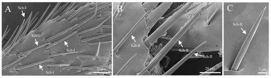 Sensilla chaetica are the second-largest type of sensilla on the legs, classified into two subtypes: s. chaetica I and s. chaetica II. S. chaetica I is primarily distributed on the tibia and tarsus, with a smooth surface, growing upright towards the tarsus. It gradually tapers from the base to a sharp tip, measuring approximately 35.4 ± 4.5 μm in length and 3.7 ± 0.6 μm in basal width (Figure 15A). S. chaetica II is the most robust type of sensillum, exclusively located at the junction between the tibia and tarsus. A row of these sensilla encircles the edge of the tibia, with a surface featuring longitudinal striations and a rounded tip. The length of s. chaetica II is approximately 68.5 ± 3.7 μm, with a basal width of about 8.6 ± 1.2 μm (Figure 15B,C).