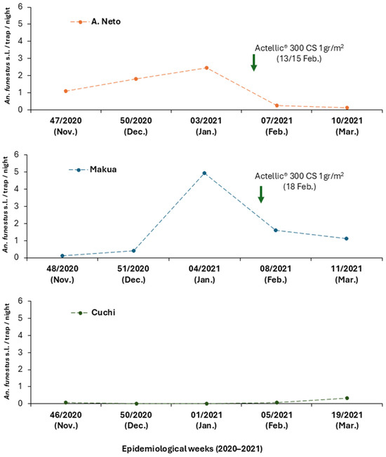Effect of Actellic® 300 CS on An. funestus s.l. VD across the three collection sites (A. Neto, Makua, and Cuchi) over epidemiological weeks from November 2020 to March 2021.