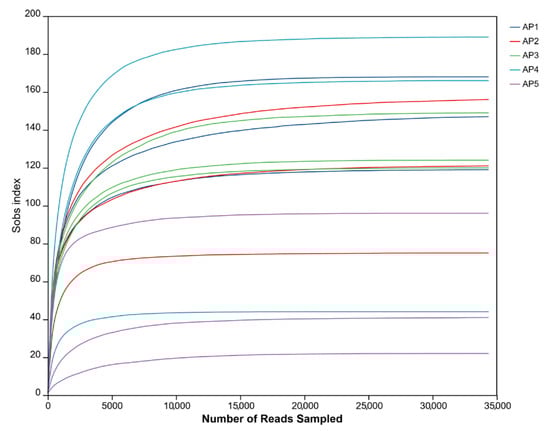Using the Illumina MiSeq platform, we conducted paired-end sequencing of the V3-V4 hypervariable regions of 16S rRNA gene amplicons derived from 15 samples (3 replicates for each instar from AP1 to AP5). After quality control and optimization, a total of 923,206 high-quality sequences were obtained, with an average length of 413 bp (Table 1). Denoising was performed using DADA2, which involved comparing single-nucleotide differences and clustering quality-filtered sequences. This process yielded a total of 789 amplicon sequence variants (ASVs) across all samples, with a minimum of 23 in sample AP5_1 and a maximum of 189 in AP4_2. Among these, the average number of ASVs in 1st-instar larvae (AP1) was significantly higher than in other developmental instars. Rarefaction curve analysis showed that as sequencing depth increased, the number of observed species in each sample group gradually plateaued and eventually reached saturation (Figure 2). These results demonstrate the reliability of the experimental data, accurately reflecting the true composition of microbial communities in the samples.
