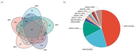 Venn diagram and pie chart of the ASVs in A. pernyi larvae across different instars. (a) Venn diagram of the ASVs in A. pernyi larvae across different instars. (b) Pie chart of shared 27 ASVs across all instar stages.