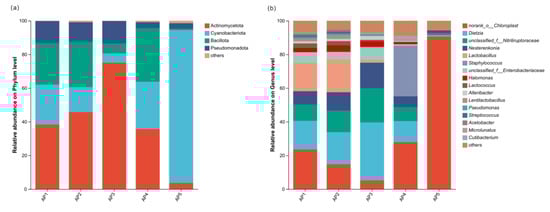 Composition of gut microbiota of A. pernyi larvae across different instars. (a) At the phylum level. (b) At the genus level. Note: The horizontal axis represents instars 1st, 2nd, 3rd, 4th, and 5th; the vertical axis represents the relative microbiota abundances in the sample.