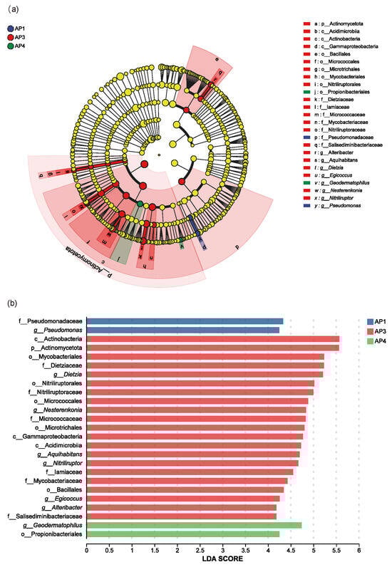 Linear discriminant analysis effect size (LefSe) was employed to identify microbial taxa that significantly characterize the differences in gut microbiota across developmental instars (Linear discriminant analysis, LDA > 4). The results revealed significantly enriched microbial taxa in the guts of 1st-, 3rd-, and 4th-instar A. pernyi larvae, with 25 microbial taxonomic units showing significant differences identified (Figure 5a).