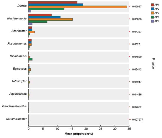 Significance test of genus differences in the gut microbiota of A. pernyi larvae. Note: * 0.01 < p ≤ 0.05, ** 0.001 < p ≤ 0.01.