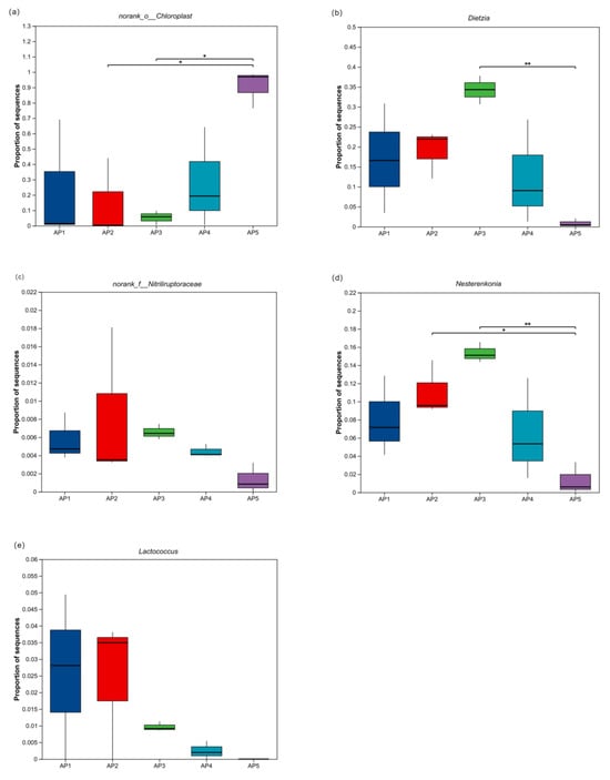 Analysis of compositional differences in the gut microbiota of A. pernyi larvae across different instars. (a) norank_o__Chloroplast. (b) Dietzia. (c) Nesterenkonia. (d) unclassified_f__Nitriliruptoraceae. (e) Lactobacillus. Note: * 0.01 < p ≤ 0.05, ** 0.001 < p ≤ 0.01.