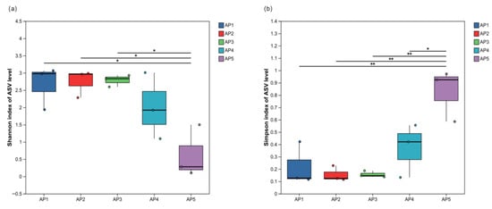 Significance tests for intergroup differences in gut microbiota diversity indices of A. pernyi larvae across different instars. (a) Shannon index of A. pernyi larvae across different instars; (b) Simpson index of A. pernyi larvae across different instars. Note: The asterisk represented significant differences. *: p ≤ 0.05, **: p ≤ 0.01.