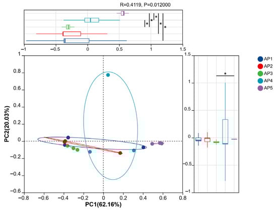 PCoA was performed on the ASV classification levels of gut microbiota in A. pernyi larvae. Note: * 0.01 < p ≤ 0.05.