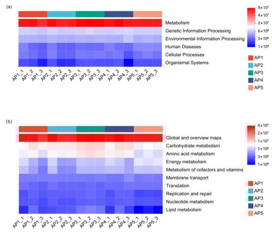 Annotations of the KEGG pathways for gut microbiota gene functions. (a) KEGG primary pathway annotation level. (b) KEGG secondary pathway annotation level.