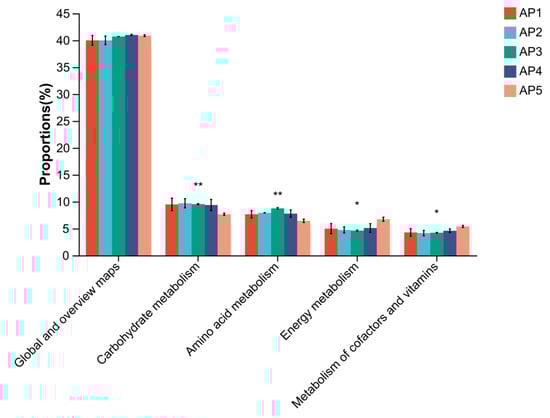 Analysis of gene functional differences in the gut microbiota of A. pernyi larvae. *: p ≤ 0.05, **: p ≤ 0.01.