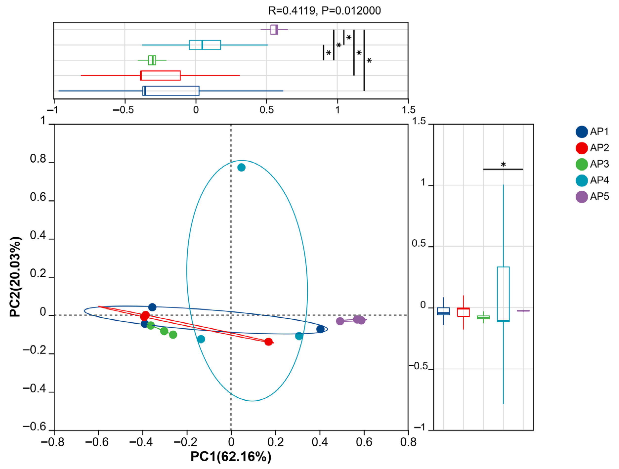 2.5. Statistical Analysis of Sequencing Data from the Gut of A. pernyi Larvae