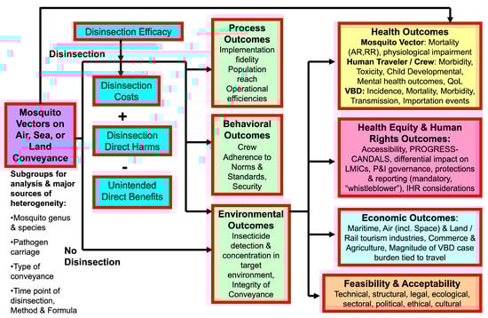 Outcomes of interest are as described above for the PICO framework (Table 1). Likewise, the broader analytic framework (Figure 1) encompasses multiple outcome domains, including unintended human health and safety effects of disinsection, the prevalence of mosquitoes aboard international conveyances, the prevalence of mosquitoes at ports of entry (including airport malaria), secondary operational public health, and systems-level outcomes. These additional outcome domains will be addressed in subsequent systematic reviews. The primary outcome addressed herein and leading to the generation of the Summary of Findings tables reported here is the efficacy of disinsection, with the outcomes of relative and absolute mosquito mortality.