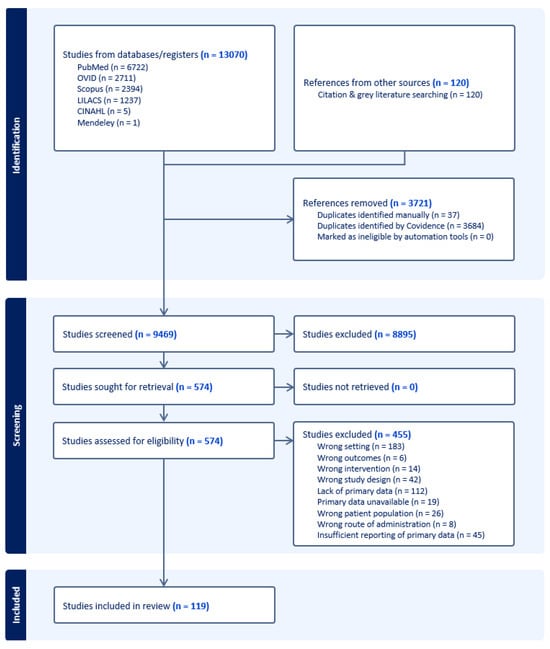 OpenGrey and the Grey Literature Report databases were also searched for additional literature, including conference proceedings, dissertations, and other documents. Bibliographies of key papers were also hand-searched for relevant literature not captured by the above search strategy. Following de-duplication, this strategy identified a total of 9469 unique studies, which underwent double-screening by two authors at the title and abstract stage (Figure 2). After title and abstract screening, 574 unique papers were identified for full-text screening (Figure 2). Following double-review by two authors, 455 full-texts were excluded for reasons indicated in the PRISMA flow diagram (Figure 2) and 119 were included for data extraction and synthesis across all outcomes of interest.