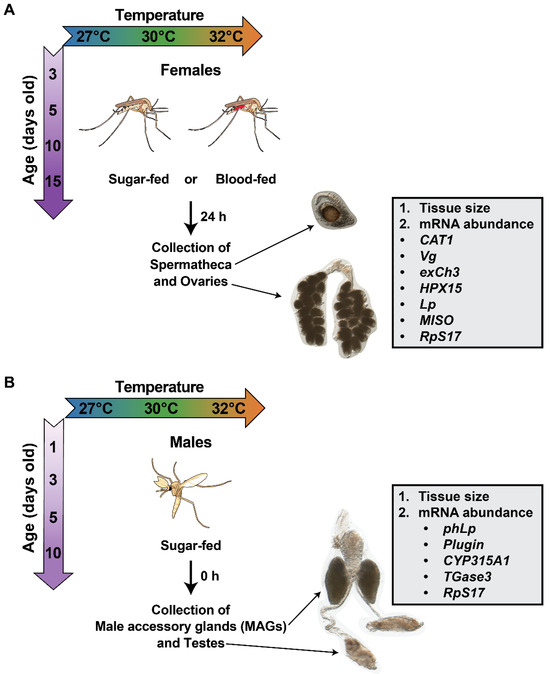 Experimental overview to determine the effects of warmer temperature, aging, and their interaction on female and male reproductive tissues. (A) Females were reared at 27, 30, or 32 °C and received a sugar or blood meal at 3, 5, 10, or 15 days of age. At 24 h after feeding, female spermathecae and ovaries were collected and assayed for tissue size or gene expression. (B) Males were reared at 27, 30, or 32 °C and fed sugar. At 1, 3, 5, or 10 days of age, male accessory glands (MAGs) and testes were dissected and assayed for tissue size or gene expression. Images of reproductive tissues are not to scale.