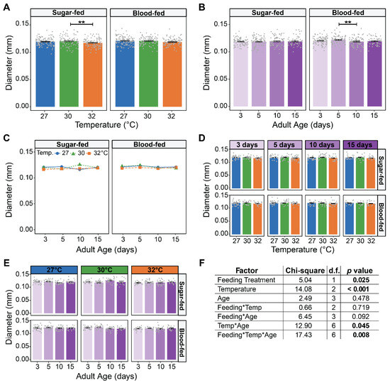 Warmer temperature and aging do not affect spermatheca size. (A) Mean spermatheca diameter of females reared at each temperature that took a sugar or blood meal, irrespective of age. (B) Mean spermatheca diameter of females that took a sugar or blood meal at each age, irrespective of temperature. (C) Interaction plot showing the mean spermatheca diameter of females that took a sugar or blood meal at each temperature within each age group. (D,E) Mean spermatheca diameter of females that took a sugar or blood meal at each temperature within each age group (D) or at each age within each temperature group (E). (F) Statistical outcomes determined by a generalized linear regression model (gaussian family with log link) followed by a type-II ANOVA Wald Chi-square test with Kenward–Roger approximation of degrees of freedom. The same data are plotted multiple ways: main effects of temperature and age (within feeding group) are shown in (A) and (B), respectively, and unaggregated data are shown in (D,E). In (A,B,D,E), bars represent means, whiskers indicate the SEM, and grey dots show individual female data points. Sidak-adjusted post hoc comparisons of means in (A,B) are indicated by asterisks: ** p < 0.01.