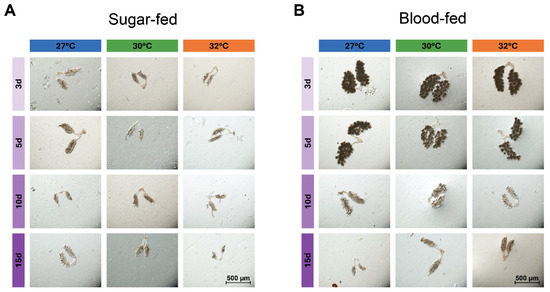 Effects of warmer temperature, aging, and their interaction on female ovaries. (A,B) Representative images of ovaries from females that were reared at 27, 30, or 32 °C and were sugar-fed (A) or blood-fed (B) at 3, 5, 10, or 15 days of age. Ovaries were dissected 24 h after feeding. Quantitative analyses of ovary size are presented in Figure 4 and Figure S1.
