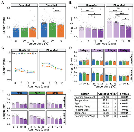 Warmer temperature accelerates the aging-dependent decrease in ovary length in blood-fed females. (A) Mean ovary length of females reared at each temperature that took a sugar or blood meal, irrespective of age. (B) Mean ovary length of females that took a sugar or blood meal at each age, irrespective of temperature. (C) Interaction plot showing the mean ovary length of females that took a sugar or blood meal at each temperature within each age group. (D,E) Mean ovary length of females that took a sugar or blood meal at each temperature within each age group (D) or at each age within each temperature group (E). (F) Statistical outcomes determined by a generalized linear regression model (gaussian family with log link) followed by a type-II ANOVA Wald Chi-square test with Kenward–Roger approximation of degrees of freedom. The same data are plotted multiple ways: main effects of temperature and age (within feeding group) are shown in (A) and (B), respectively, and unaggregated data are shown in (D,E). In (A,B,D,E), bars represent means, whiskers indicate the SEM, and grey dots show individual female data points. Sidak-adjusted post hoc comparisons of means in (A,B) are indicated by asterisks: *** p < 0.001, ** p < 0.01, and * p < 0.05.