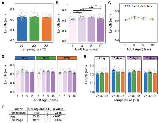 Warmer temperature delays and lessens the initial increase in male accessory gland (MAG) length. (A) Mean MAG length of males reared at each temperature, irrespective of age. (B) Mean MAG length of males at each age, irrespective of temperature. (C) Interaction plot showing the mean MAG length of males at each temperature within each age group. (D,E) Mean MAG length of males at each temperature within each age group (D) or at each age within each temperature group (E). (F) Statistical outcomes determined by a generalized linear regression model (gaussian family with log link) followed by a type-II ANOVA Wald Chi-square test with Kenward–Roger approximation of degrees of freedom. The same data are plotted multiple ways: main effects of temperature and age (within feeding group) are shown in (A) and (B), respectively, and unaggregated data are shown in (D,E). In (A,B,D,E), bars represent means, whiskers indicate the SEM, and grey dots show individual male data points. Sidak-adjusted post hoc comparisons of means in (A,B) are indicated by asterisks: *** p < 0.001 and * p < 0.05.