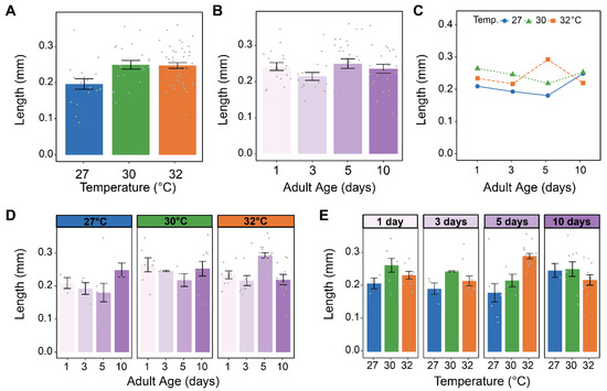 Warmer temperature increased the size of the testes, which was mostly manifested in increased length (Figure 5, Figure 7A and Figure S3A). Testes were 27% longer at 30 °C than at 27 °C, but there was no meaningful size difference between 30 °C and 32 °C. Aging non-uniformly affected the size of the testes (Figure 7B and Figure S3B). Specifically, testes length was smallest at 3 days of age but was relatively similar at all other ages, whereas testes width was the same from 1 to 5 days of age but smallest at 10 days of age. Finally, warmer temperature and aging do not appear to interact to shape testes length or width (Figure 7C–E and Figure S3C–E).