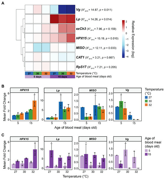 To determine whether warmer temperature and aging individually and interactively shape the expression of genes involved in reproduction within the female reproductive tissues (spermathecae, ovaries, and their connecting tissue), we assessed 5-day-old and 15-day-old adult females at each temperature at 24 h after blood feeding. These ages were selected because female fertility is greatest at 5 days of age and lowest at 15 days of age [31]. We assayed genes involved in several aspects of female reproduction: (i) Na+/K+/Ca2+ exchanger 3 (exCh3) and heme peroxidase 15 (HPX15), both of which protect sperm [80,81]; (ii) vitellogenin (Vg) and lipophorin (Lp), which are genes that encode YPPs [2,3,82,83]; (iii) mating-induced stimulator of oogenesis (MISO) that regulates mating and lipid distribution [22,26,84,85,86,87,88]; and (iv) catalase 1 (CAT1) that mediates oxidative stress [89,90,91].
