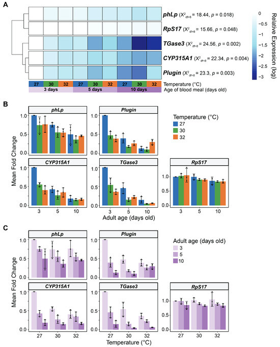 Effects of warmer temperature, aging, and their interaction on gene expression in female reproductive tissues. (A) Heatmap illustrates the relative expression of each gene across temperature-age groups. Average fold change values, relative to females reared at 27 °C receiving a blood meal at 5 days old, were log-transformed for each gene. Gene rows were clustered by expression pattern similarity. For each gene, statistical differences among temperature-age groups were detected using a non-parametric Kruskal–Wallis Chi-square rank sum test. (B,C) Mean fold change in female reproductive genes that differed across temperature-age groups. Column heights mark the mean mRNA fold change, relative to females reared at 27 °C receiving a blood meal at 5 days old, at each temperature within each age group (B) or at each age within each temperature group (C). Whiskers indicate the SEM, and black dots show the values for each trial. RpS7 was used as the reference gene, and RpS17 was used as the control gene.