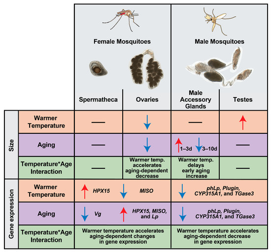 Warmer temperature accelerates reproductive senescence in female mosquitoes, reducing fecundity and fertility earlier in life [31]. Here, we demonstrate that warmer temperature modifies the aging-dependent changes in the size of female and male reproductive tissues and the expression of reproductive genes in ways that reflect declining fecundity and fertility (Figure 10).