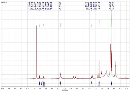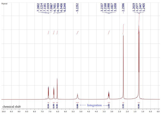 The 1H NMR spectrum (Table 1, Scheme 2) of compound (38) was similar to that of compound (37), but the olefinic methyl proton signal appeared at δH 2.21 (s, 3H-10) and the isopropyl unit at δH 2.82 (pent, J = 6.9 Hz, H-7), confirming the identification of compound (38) as carvacrol. This was in agreement with previously published spectral data from the literature [36,37].