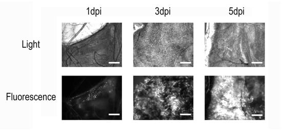 Finally, three samples of larvae from each time point of the last infection experiment, as well as two uninfected controls, were analyzed not only for synthesis of recombinant protein, but also its accumulation in insect tissues, using immunoblotting with anti-eGFP antibodies. The results confirmed that the recombinant product was not detectable before 3 dpi, when barely detectable amounts were recorded. Significant accumulation of the virus-delivered protein in the tissues was only observed starting at 5 dpi (Figure 2c).