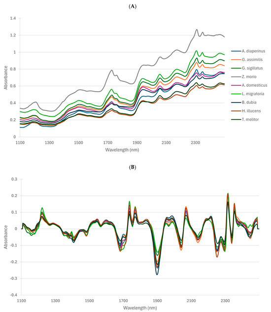 Figure 3 represents the raw absorbance spectra (A) and the preprocessed spectra (B) of different insect species (Tenebrio molitor, Hermetia illucens, Blabtica dubia, Locusta migratoria, Acheta domesticus, Zophobas morio, Gryllodes sigillatus, Gryllus assimilis, and Alphitobius diaperinus) analyzed in this study in the 1100–2500 nm range. Major absorbance bands may be observed in the different NIRS regions. The same main bands that were identified previously in [25] may be observed at about 1200, 1728, 1760, 1940, 2056, 2172, 2306, and 2348 nm. These have been related to the major organic compounds, i.e., water, protein, and fat content. However, the peaks at around 1200, 1510, 2050, and 2180 nm could also be related to the chitin constituent. Indeed, [26] measured squid pen and red snow crab shell, which are raw materials of chitin and chitosan, and showed these four typical peaks in the NIRS spectra. According to [27,28], spectral bands at 1200, 1510, and 2050 nm may be associated with second overtone C-H stretching, first overtone N-H stretching, and N-H stretching + amide II, respectively.