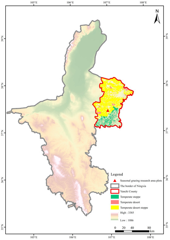 The study site is located in Yanchi County (37°04′–38°10′ N, 106°30′–107°47′ E), eastern Ningxia, situated at the junction of Shaanxi, Gansu, Ningxia, and Inner Mongolia provinces. Elevation ranges between 1295 and 1951 m, positioning it within China’s agro-pastoral ecotone. The local climate is characterized as a typical temperate continental climate, with an average annual frost-free period of 188 days, mean annual temperature of 7.8 °C, and annual precipitation of 250–350 mm [30]. Within this area, the grazing experimental plots were established in 2019 at Dashuikeng Town (37°24′19″ N, 106°58′48″ E). Prior to establishment, the site consisted of semi-natural temperate desert steppe (Figure 1).