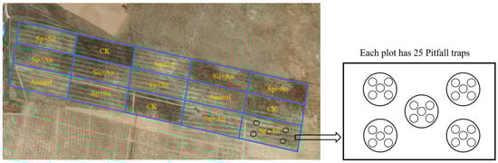 Ground-dwelling insects were sampled using pitfall traps. The trapping protocol was as follows: Within each experimental plot, five sampling points were established in a five-point sampling pattern. At each point, five traps were deployed with 5-m intervals between adjacent traps. This resulted in 25 traps per plot, totaling 375 traps across all 15 plots. Disposable transparent cups (height: 11.5 cm; diameter: 9 cm) were buried with their rims flush with the ground surface. Each cup was filled to one-third of its volume with trapping solution (ethylene glycol:water = 1:2, v/v, ethylene glycol was purchased from Tianjin Fuyu Fine Chemical Co., Ltd., Tianjin, China). Insects were collected at 10-day intervals and preserved in 95% ethanol, ethanol was purchased from Tianjin Beilian Fine Chemicals Development Co., Ltd., Tianjin, China [1]. All insect specimens were transported to the laboratory for pinning and mounting. Species identification and documentation were conducted primarily with reference to the following literature: Colored Pictorial Handbook of Grassland Insects in Ningxia [31], Fauna of the Beetles from Ningxia, China [32], and Insects of Helan Mountain in Ningxia [33]. Insects were classified into herbivorous and predatory groups (see Tables S1 and S2 for details) for analysis based on a comprehensive examination of individual morphological characteristics (e.g., mouthpart types, appendage structures) and documented ecological records of the taxonomic units (as referenced in literature sources [31,32,33]). The determination of dominant species was based on the proportion of individual numbers of each insect species to the total number of individuals in the community. Species with a proportion below 1% were classified as rare species, those between 1% and 10% as common species, and those exceeding 10% as dominant species [34].