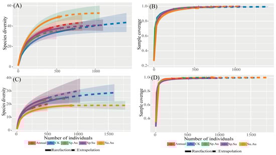 Insect community diversity across grazing regimes based on rarefaction extrapolation analysis. Note: (A) Rarefaction/extrapolation curves for herbivorous insect samples. (B) Sample completeness curve for herbivorous insects. (C) Rarefaction/extrapolation curves for predatory insect samples. (D) Sample completeness curve for predatory insects. Solid lines were generated by interpolation, dashed lines by extrapolation.