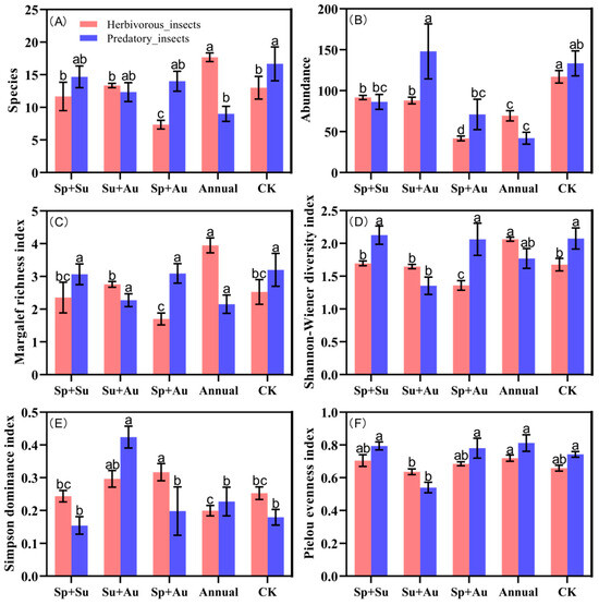Significant variations emerged among herbivorous insect diversity indices across grazing regimes (red bars, Figure 4). For species richness: Year-round grazing (Annual) yielded the highest richness, significantly exceeding other regimes (p < 0.05). Spring-autumn grazing (Sp+Au) exhibited the lowest richness, while spring-summer (Sp+Su), summer-autumn (Su+Au), and no-grazing (CK) showed statistically comparable richness levels (p > 0.05), indicating similar regulatory effects on herbivore richness among these three treatments (Figure 4A). Regarding abundance: CK demonstrated the highest herbivore abundance, significantly surpassing grazed treatments (p < 0.05). Sp+Su and Su+Au maintained intermediate abundance levels, whereas Sp+Au resulted in minimal abundance (Figure 4B). Margalef and Shannon-Wiener indices both peaked under Annual grazing, showing significant advantages over other regimes (p < 0.05), while reaching their minima under Sp+Au. This reflects weakened species accumulation capacity and significantly reduced diversity under Sp+Au. Intermediate values without significant differences characterized the remaining treatments (Figure 4C,D). Simpson dominance index was elevated under Su+Au and Sp+Au but minimized under Annual grazing (Figure 4E). Pielou evenness exhibited modest differences across regimes, indicating relatively balanced distribution of herbivorous individuals within communities (Figure 4F).