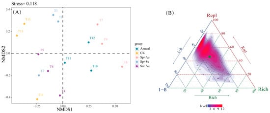Non-metric Multidimensional Scaling (NMDS) based on Bray–Curtis dissimilarity was applied to visualize differences in insect community structure across grazing regimes. This method effectively handles the non-linear nature of ecological data and projects ecological distances between samples into a low-dimensional ordination space. Stress values were used to evaluate the reliability of the NMDS configuration; a value below 0.2 generally indicates good interpretability. To further investigate the disparities in community structure under different grazing conditions and their underlying drivers, beta diversity was partitioned into two ecologically meaningful components: species turnover (Repl) and richness differences (Rich) [2].