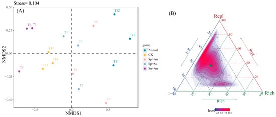NMDS ordination and beta diversity partitioning of predatory insects across grazing regimes. Note: (A) Compositional differences of predatory insect communities across grazing regimes, where points represent individual experimental quadrats. (B) Ternary plot depicting total predatory insect beta diversity and its components (Repl: replacement diversity; Rich: richness difference) under different regimes. Green dots indicate mean beta diversity values (hereafter identical).