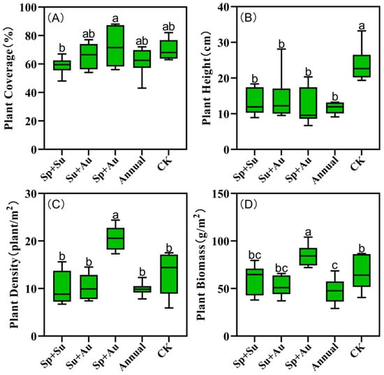 Vegetation structural indices in grazing plots. Note: Data represent mean ± SE. Based on Duncan’s new multiple range test (DMRT), different lowercase letters indicate significant differences in vegetation structural indices across grazing regimes (p < 0.05), while identical letters denote non-significant differences. (A) Plant cover of plots under different grazing regimes. (B) Plant height of plots under different grazing regimes. (C) Plant density of plots under different grazing regimes. (D) Plant biomass of plots under different grazing regimes.