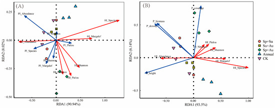RDA ordination of herbivorous insect diversity in response to environmental predictors across grazing regimes. Note: (A) RDA ordination between herbivorous and predatory insect diversity indices. (B) RDA ordination between herbivorous insect diversity and vegetation structural parameters. Abbreviations: HI_Species: Herbivorous insect species richness; HI_Abundance: Herbivorous insect abundance; HI_Margalef: Margalef richness index of herbivores; HI_Shannon: Shannon-Wiener diversity index of herbivores; HI_Simpson: Simpson dominance index of herbivores; HI_Pielou: Pielou evenness index of herbivores; P_coverage: Vegetation coverage; P_height: Vegetation height; P_density: Vegetation density; P_biomass: Aboveground biomass (hereafter identical). Red arrows represent herbivorous insect diversity indices; blue arrows denote environmental factors. Acute angles between arrows indicate positive correlations; obtuse angles indicate negative correlations.