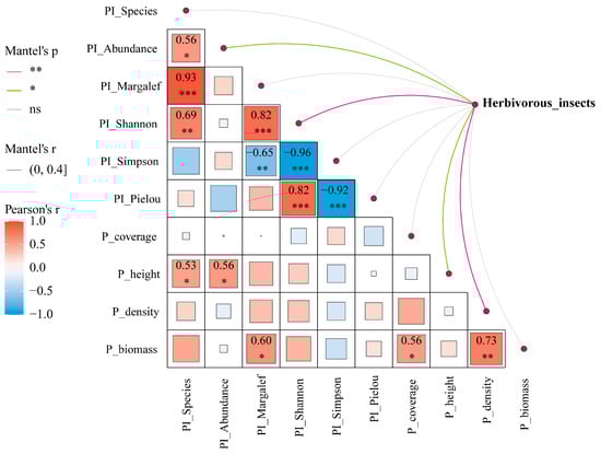 Mantel test-based ecological association analysis revealed significant correlations between herbivorous insect communities and predatory insect diversity indices/vegetation structural parameters across grazing regimes. Results demonstrated that PI_Abundance and P_height exerted significant positive effects on herbivorous insect communities (p < 0.05), while PI_Shannon and P_height showed stronger positive driving effects (p < 0.01). Additionally, P_height exhibited significant positive relationships with PI_Species and PI_Abundance (p < 0.05), and P_biomass was positively correlated with PI_Margalef (p < 0.05) (Figure 9).