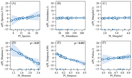 GAM response curves of herbivorous insect abundance to predatory insect diversity. Note: (A) Effect of predatory insect species richness on the abundance of herbivorous insects. (B) Effect of predatory insect abundance on the abundance of herbivorous insects. (C) Effect of the Margalef richness index of predatory insects on the abundance of herbivorous insects. (D) Effect of the Shannon-Wiener diversity index of predatory insects on the abundance of herbivorous insects. (E) Effect of the Simpson dominance index of predatory insects on the abundance of herbivorous insects. (F) Effect of the Pielou evenness index of predatory insects on the abundance of herbivorous insects.