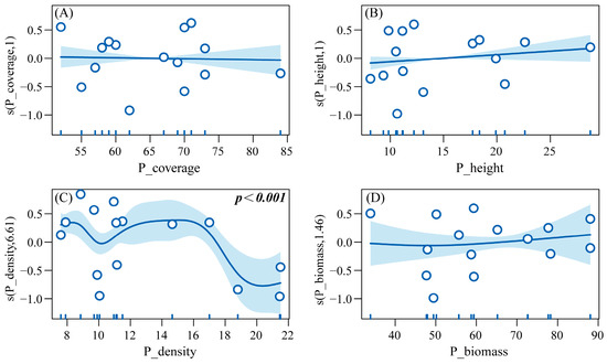GAM response curves of herbivorous insect abundance to vegetation structural indices. Note: (A) Effect of plant cover on the abundance of herbivorous insects. (B) Effect of plant height on the abundance of herbivorous insects. (C) Effect of plant density on the abundance of herbivorous insects. (D) Effect of plant biomass on the abundance of herbivorous insects.