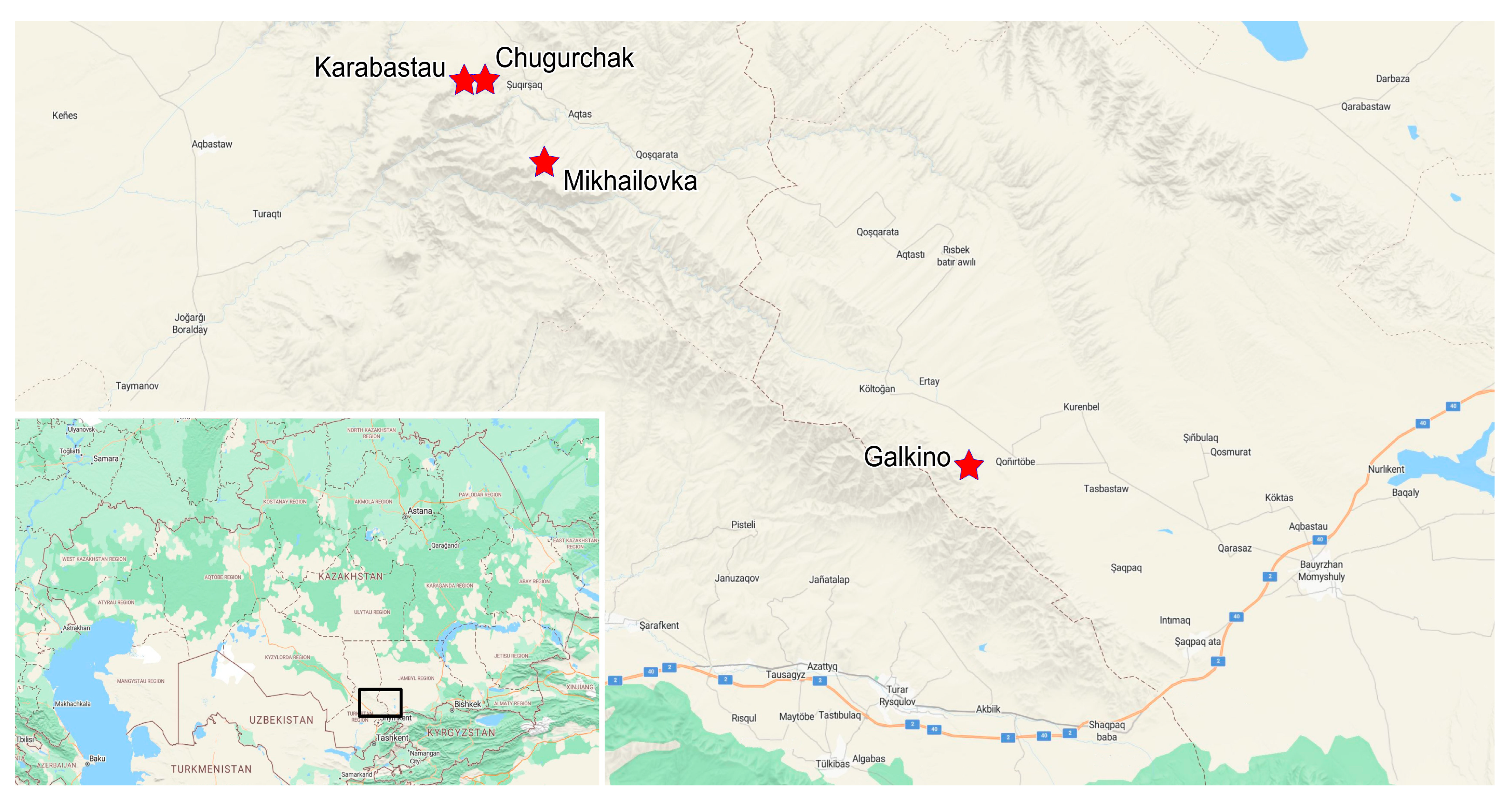 - Nigmatova, S.A.; Kosenko, A.A.; Dzhumanov, S.; Usipova, A.B.; Shermahan, B. Jurassic Lake of Karatau: The Present State of the Unique Location of the Fossil Flora and Fauna. News Natl. Acad. Sci. Repub. Kazakhstan Ser. Geol. Tech. Sci. 2017, 3, 10–23. [Google Scholar]