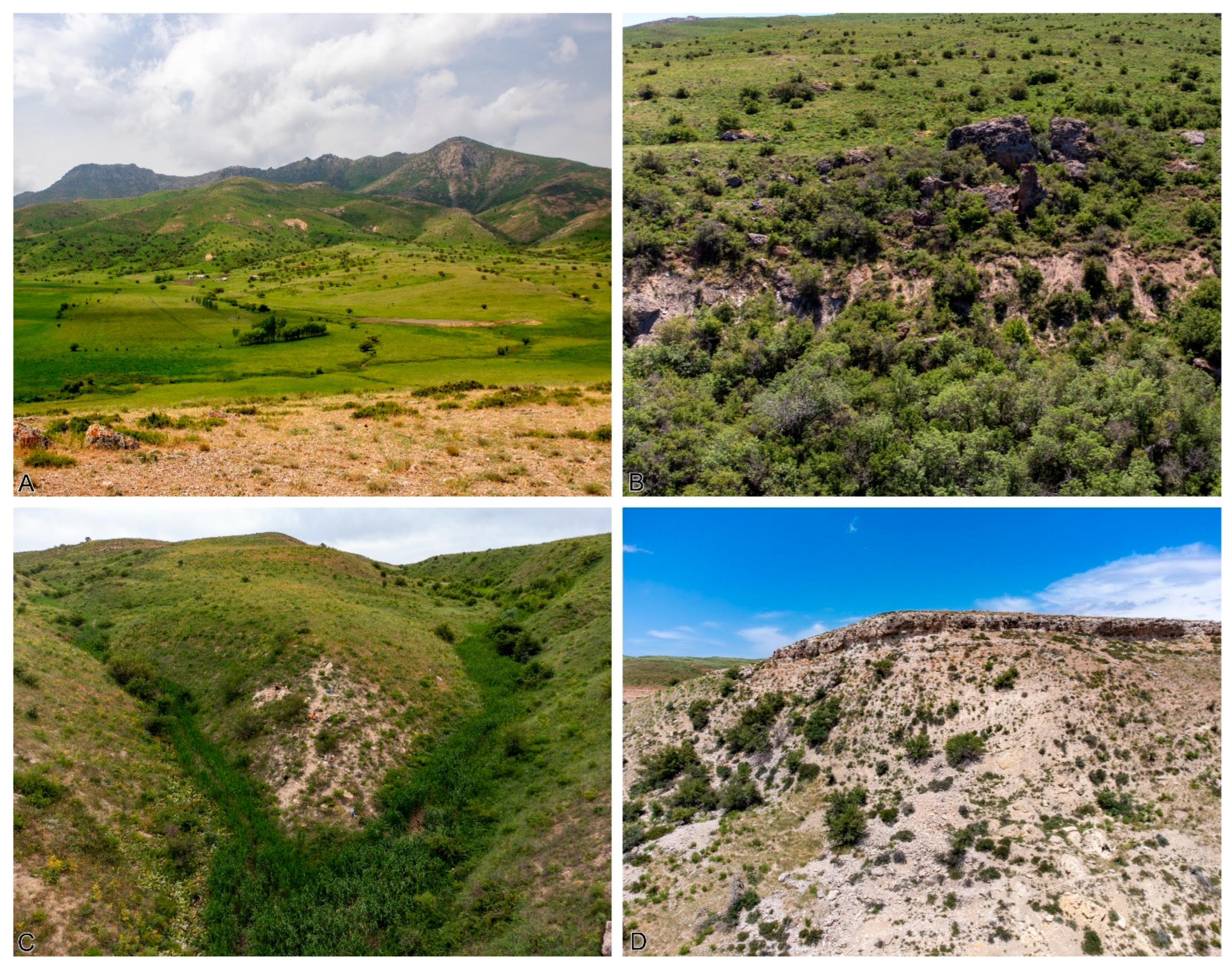 Figure 3A) is situated in a valley about 3 km west of the village of Konyrtobe (formerly Uspenovka or Galkino). It was the first locality discovered among those belonging to the Karabastau Formation and is geographically isolated from the main cluster of Karabastau sites. The main challenge of working at Galkino is the absence of large outcrops with insect-bearing shales. Instead, scattered blocks of shale are occasionally found along small streams crossing the valley. During our fieldwork, we examined four separate points in Galkino, some of which have been fully exhausted. Fossil preservation at Galkino is generally good. Fossils are found both in extremely thinly laminated “paper” shale (less than 1 mm) and in more massive shales. In our experience, both preservation quality and fossil density tend to be better in the latter. The land around the site is under private ownership (long-term lease by local farmers), but we encountered no difficulty in obtaining permission to work there. The main challenge is the patchy distribution of fossiliferous zones, which necessitates ongoing prospection and hinders correlation between individual sites.